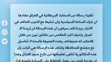 سطام ابو ريشة يكشف عن رسالة له من السفير البريطاني بترك الساحة السياسية والانضمام لحزب الحلبوسي
