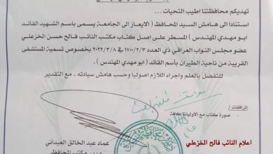 بالوثيقة محافظ البصرة يوافق على تسمية مستشفى جامعة البصرة بأسم الشهيد ابو مهدي المهندس
