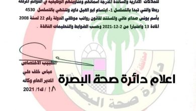 بالوثيقة صحة البصرة تعلن صرف مخصصات الخطورة البالغة (٣٠٪) للملاكات الادارية