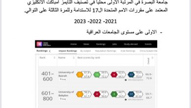 اجنادين نيوز / ANN احرزت جامعة البصرة وللمرة الثالثة على التوالي ، المرتبة الاولى محليا في تصنيف التايمز امباكت الانكليزي…