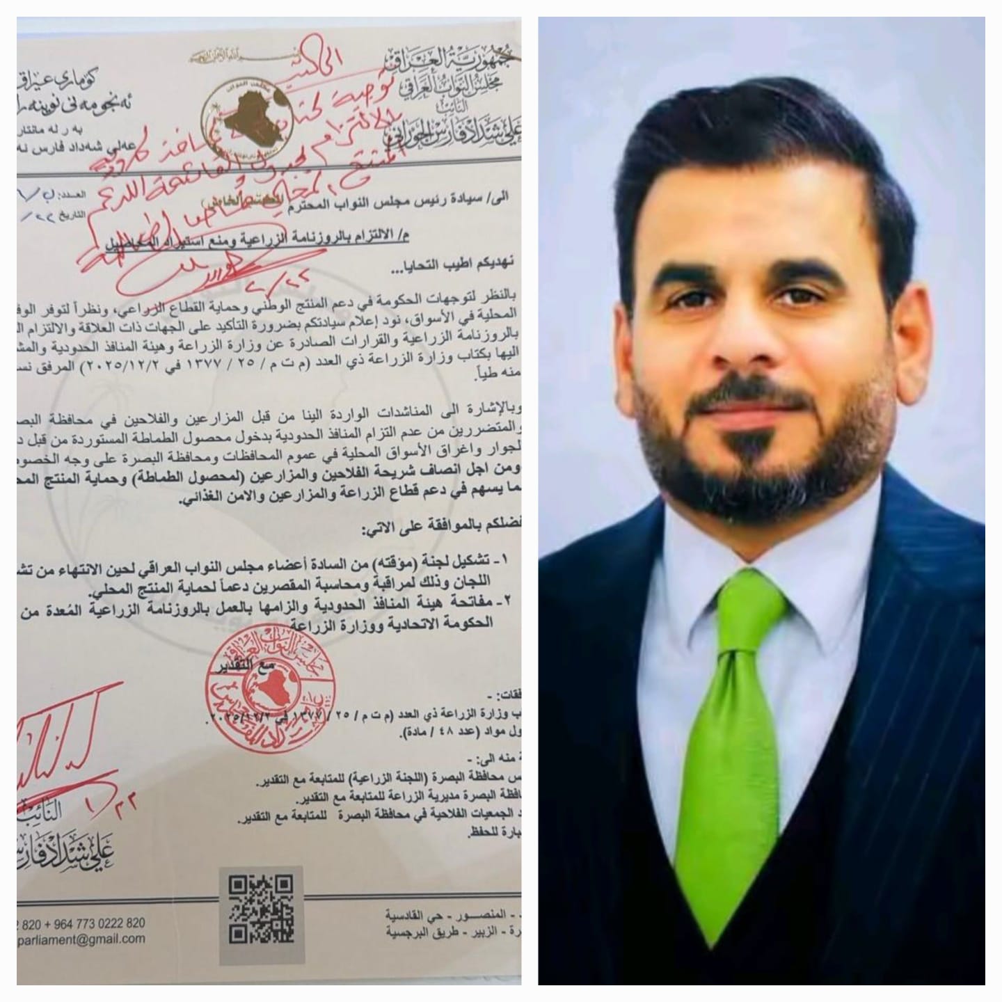 طالب النائب علي شداد الفارس بكتاب رسمي الى رئيس مجلس النواب حول التأكيد على الجهات ذات العلاقة بالالتزام بالروزنامة الزراعية ومنع استيراد الطماطم بغلق المنافذ الحدودية لحماية القطاع الزراعي