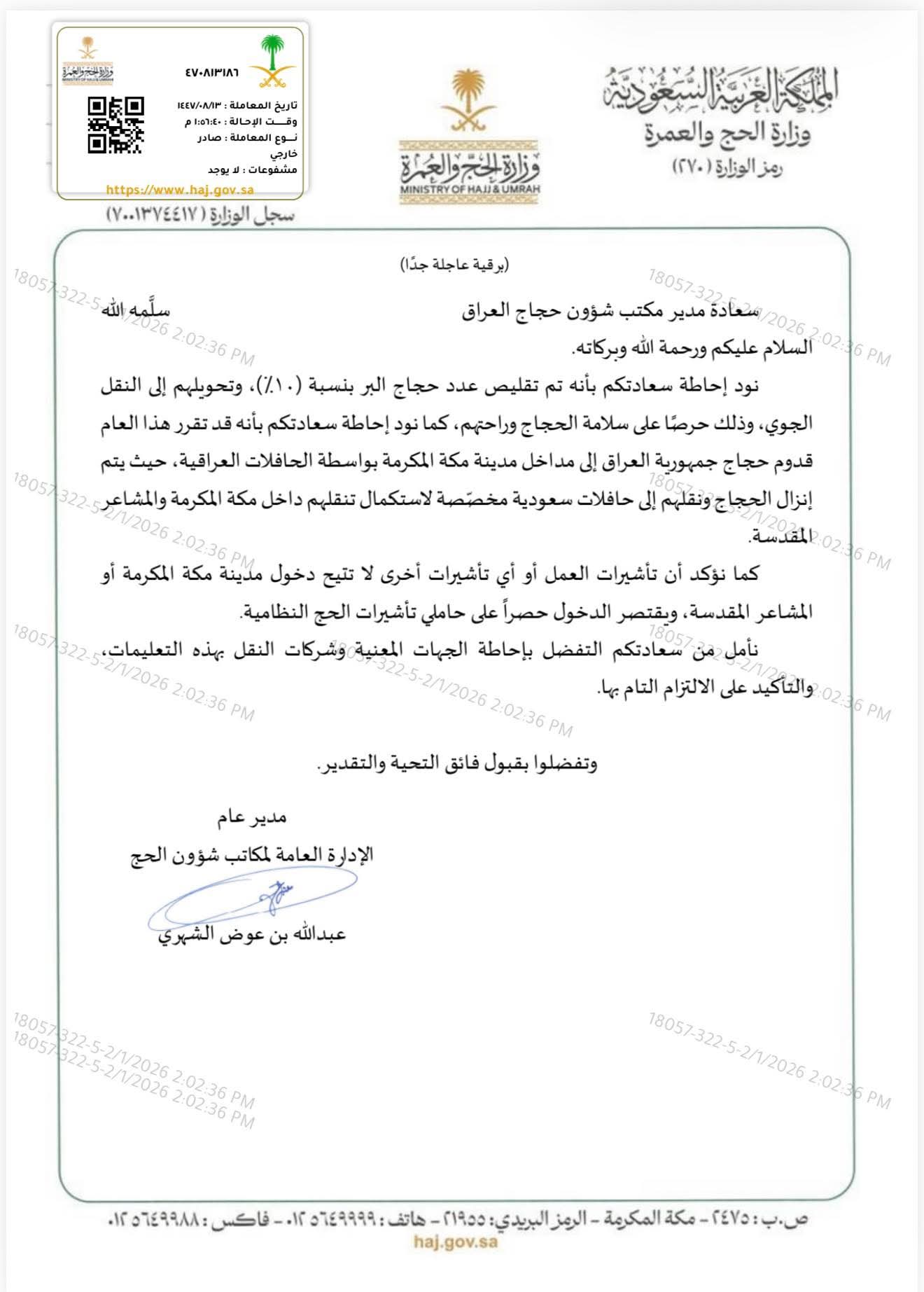بالوثيقة.. وزارة الحج السعودية تقلص دخول الباصات العراقية من المنافذ البرّية 10%خلال موسم الحج.