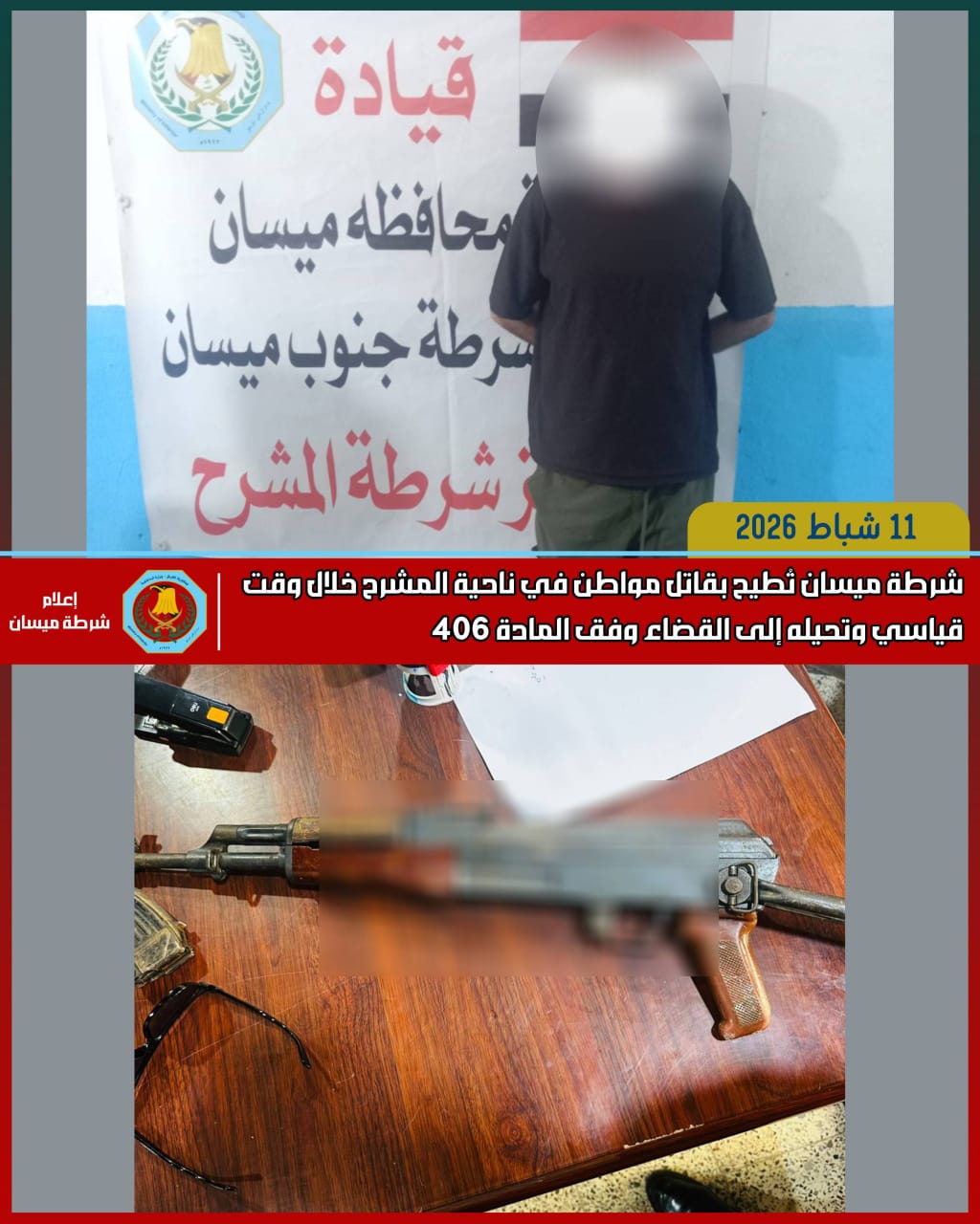 شرطة ميسان تُطيح بقاتل مواطن في ناحية المشرح خلال وقت قياسي وتحيله إلى القضاء وفق المادة 406