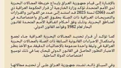وقال أبو اديان الأمم المتحدة تنشر الخرائط الرسمية للمجالات البحرية لتثبيت حدود العراق الإقليمية وهو انتصار للإرادة الوطنية وسنخوض المعركة القانونية في الساحة الاعلامية حتى استعادة حقوقنا بالكامل