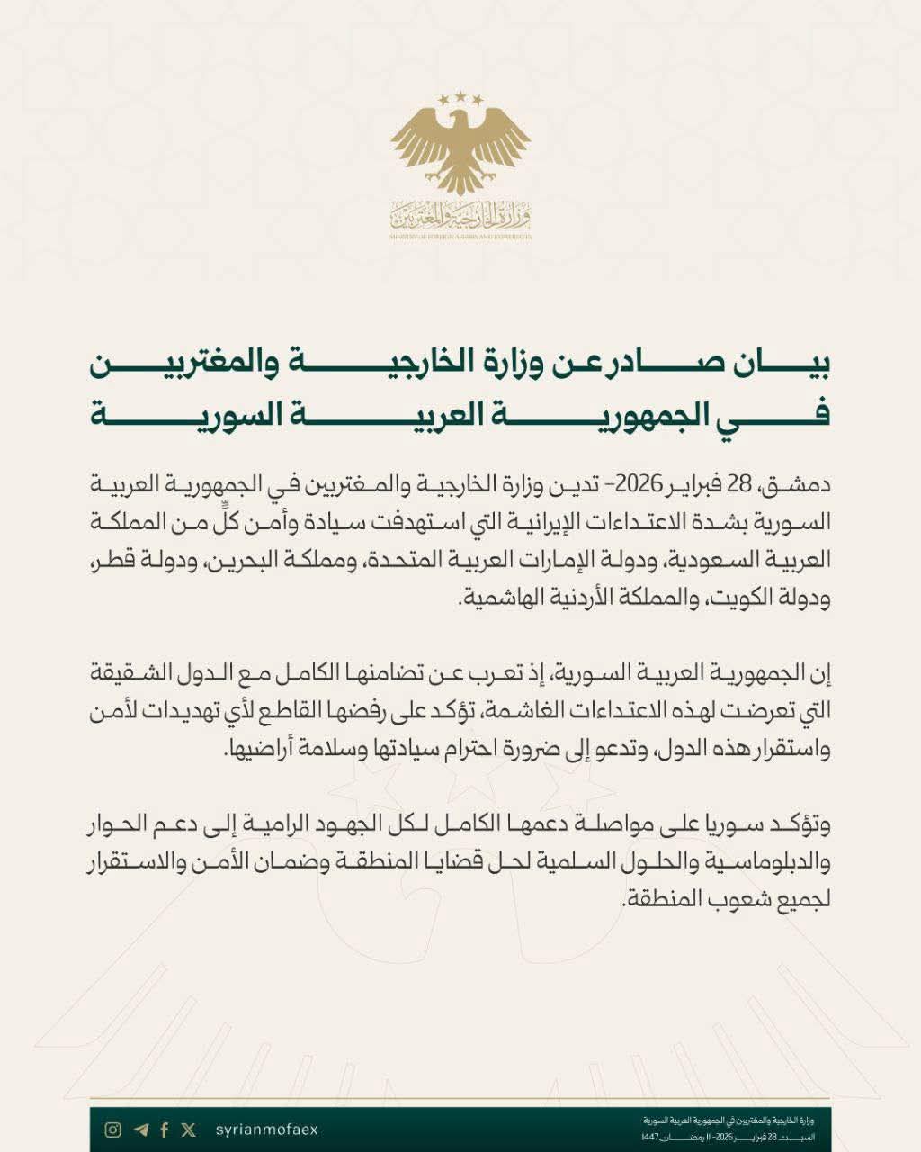 وزارة الخارجية السورية تدين “الاعتداءات الإيرانية” على السعودية والإمارات والبحرين وقطر والكويت والأردن