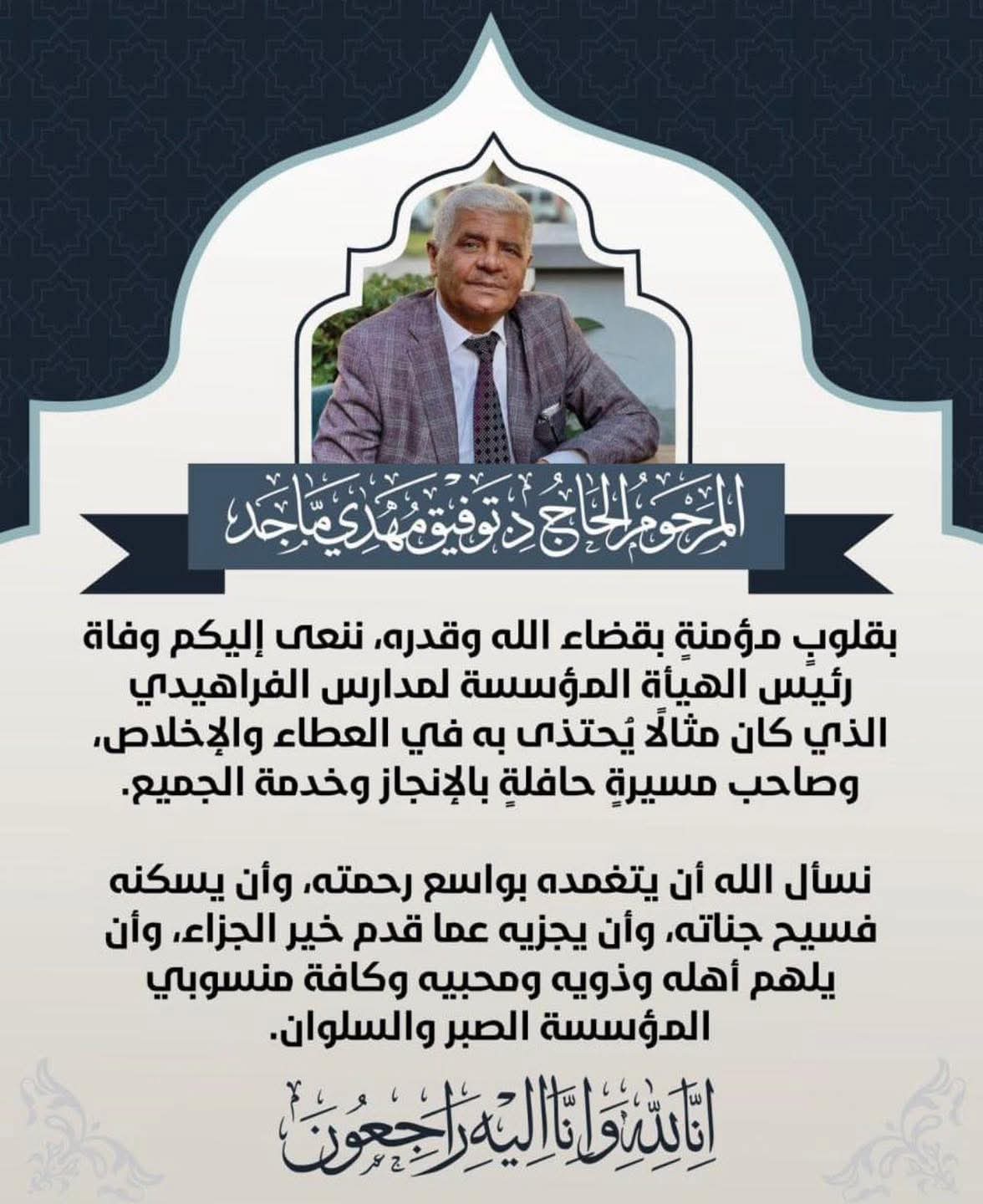 وفاة مالك ومؤسس مدارس الفراهيدي في البصرة د. توفيق مهدي