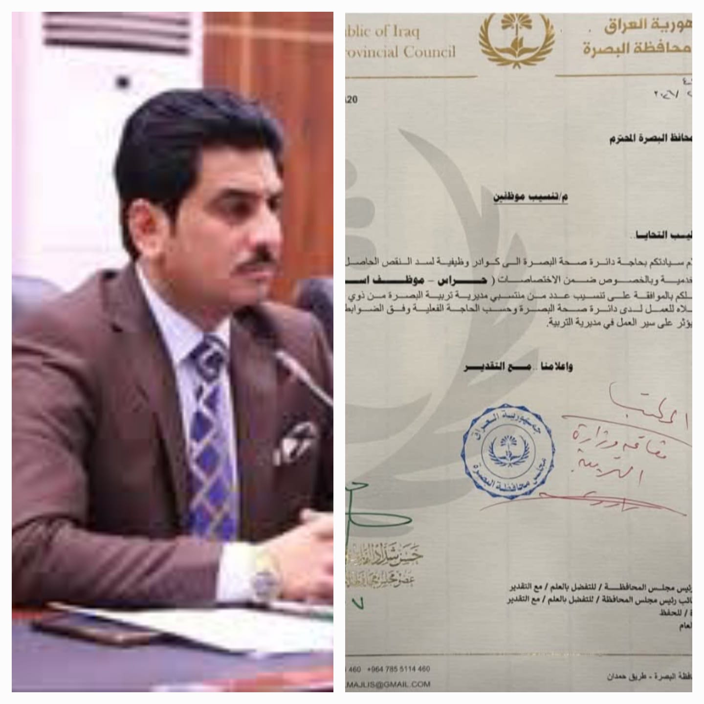 كشف عضو مجلس محافظة البصرة الأستاذ حسن شداد الفارس عن مخاطبة السيد محافظ البصرة بكتاب رسمي من قبلنا حول التعاقد مع الملاكات التمريضية ضمن ملف (13) ألف درجة وظيفية وتنسيبهم للعمل في المؤسسات الصحية
