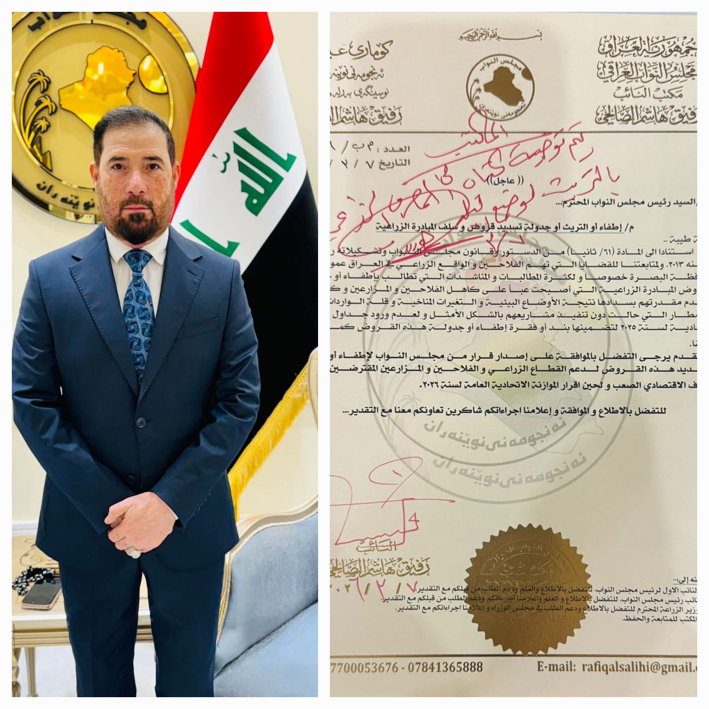 طالب عضو مجلس النواب رفيق هاشم الصالحي بإصدار كتاب من قبل مجلس البرلمان بإعفاء المقترضين او جدولة قروض المبادرة الزراعية عن الفلاحين والمزارعين لعدم قدرتهم على التسديد نتيجة الأوضاع البيئية والتغيرات المناخية وقلة الواردات المائية
