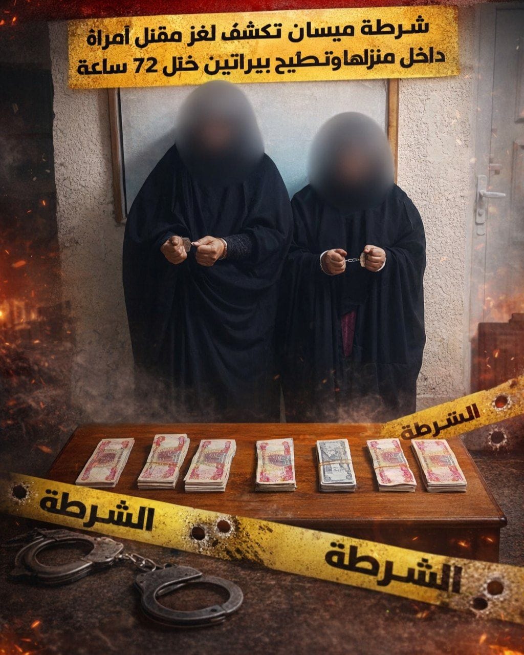 أعلنت” قيادة شرطة ميسان ان مفارز مكافحة إجرام المحافظة، تمكنت بالاشتراك مع خلية الصقور الاستخبارية ، من كشف ملابسات جريمة قتل غامضة والإطاحة بامرأتين متهمتين بقتل امرأة وحرق جثتها بدافع السرقة ، وذلك في منطقة الماجدية ضمن مركز مدينة العمارة .