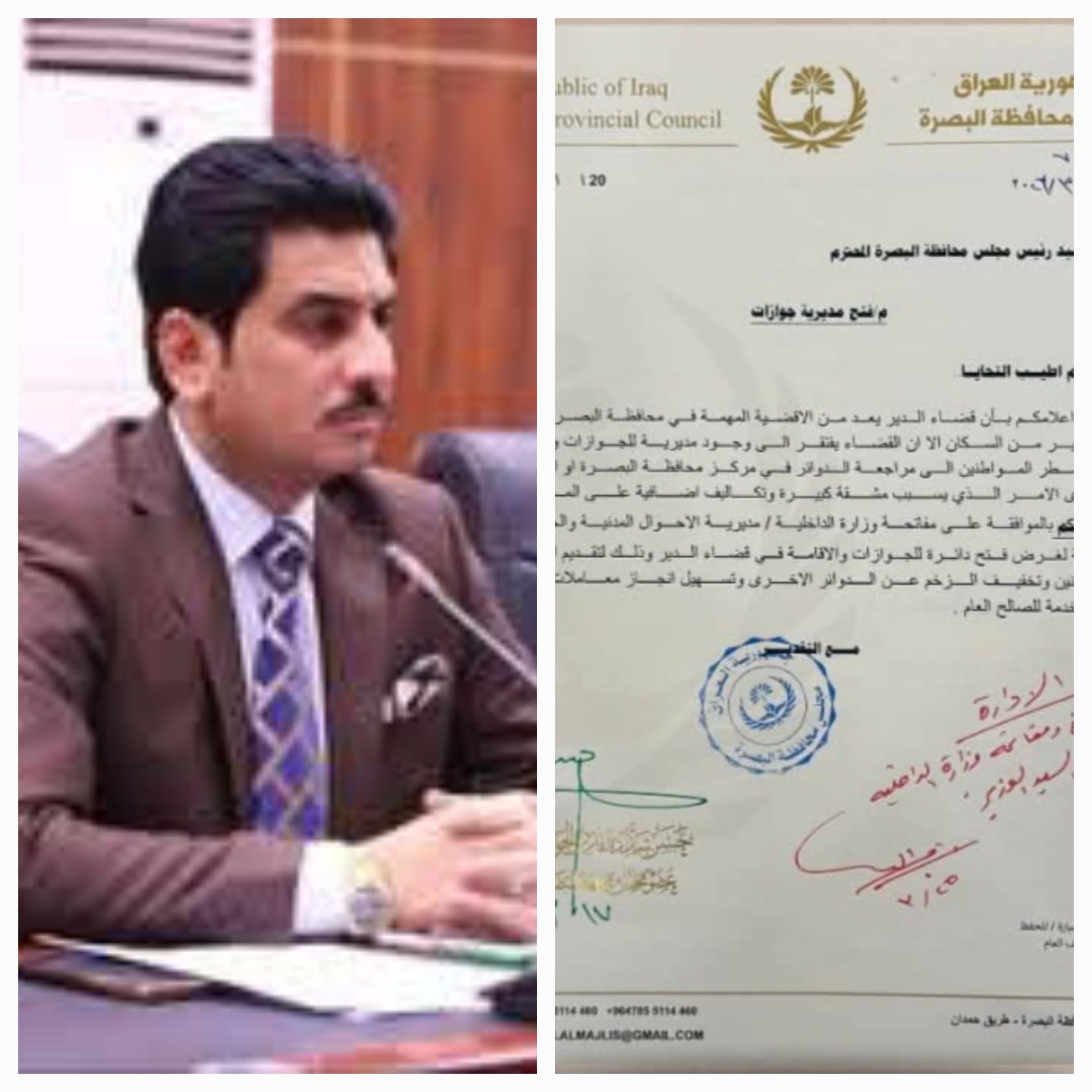 بالوثيقة .. عضو مجلس محافظة البصرة الاستاذ حسن شداد الفارس يخاطب رئاسة مجلس المحافظة بكتب رسمية لمفاتحة وزارة الداخلية / مديرية الاحوال المدنية والجوازات والاقامة لافتتاح مديرية للجوازات في قضاء الدير