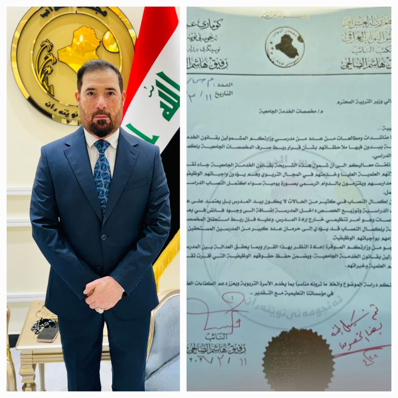 وجه النائب رفيق هاشم الصالحي كتاباً رسمياً إلى وزارة التربية بخصوص ملاحظات عدد من المدرسين حول قرار ربط صرف مخصصات الخدمة الجامعية باكتمال النصاب التدريسي