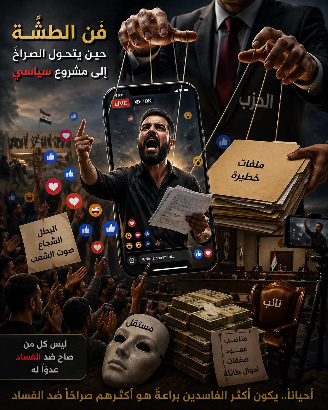 حين تبلغ الطشّة ذروتها ، يتحول صاحب البثوث والانفعالات الى مرشح “ مستقل ”، أو الى “ ابن تشرين ”، أو يوصف بأنه “ صوت الشباب المدني الواعي ” ، بينما خيوطه كلها مربوطة بغرفة عمليات حزبية تعرف متى تدفعه ومتى تلمّعه ومتى ترفعه على الأكتاف .